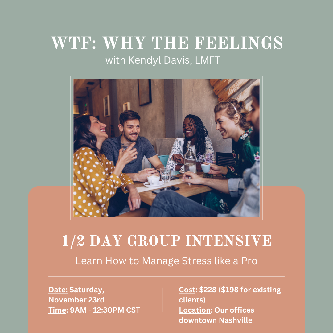 Feeling overwhelmed by life’s demands? The WTF: Why the Feelings group intensive is here to help you make sense of the chaos. This immersive experience, led by Kendyl, offers practical strategies for managing stress, regulating emotions, and building resilience. With a focus on self-awareness and emotional balance, you'll learn the tools you need to navigate life’s challenges with confidence.